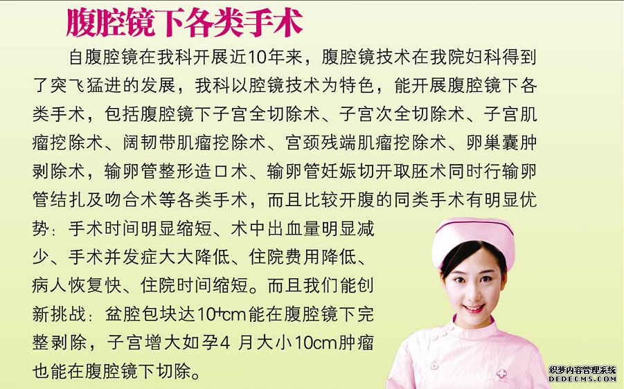 天津薊州洪偉友好男科醫院婦科是集臨床、教學、科研于一體的臨床科室,設有床位30張,配備醫護人員16名,其中主任醫師1名,副主任醫師3名,主治醫師3名,醫師1名,副主任護師1名,主管護師3名,護師3名,護士1名。科室設備先進,技術力量雄厚,對婦科各種疑難病例診治及危重病人的搶救均處于全市領先水平,尤其在腔鏡技術、新式陰式微創手術、婦科惡性腫瘤的手術治療、放療、化療等方面更有獨到之處。