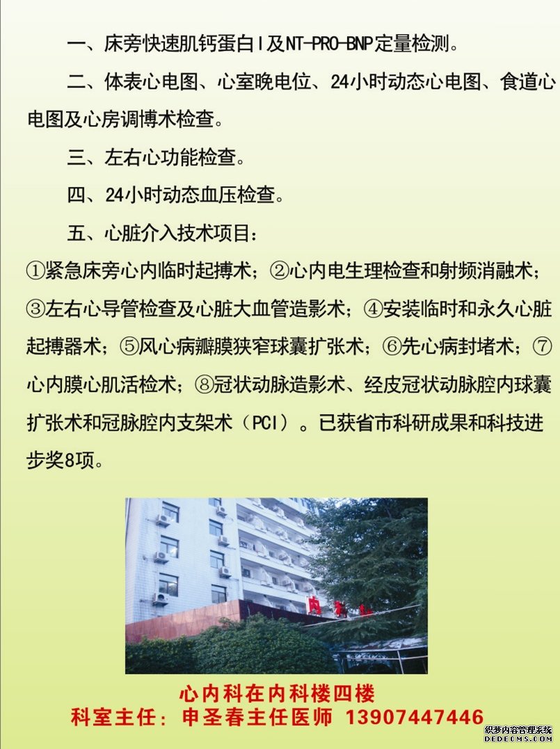 2.心臟介入診治技術(shù):冠脈造影術(shù),冠脈內(nèi)支架術(shù),心內(nèi)電生理檢查及心動(dòng)過速射頻消融術(shù),風(fēng)心病瓣膜狹窄球囊擴(kuò)張術(shù),左右心導(dǎo)管檢查術(shù),安裝心臟起搏器術(shù),心內(nèi)膜活檢術(shù),先心病封堵術(shù)等。