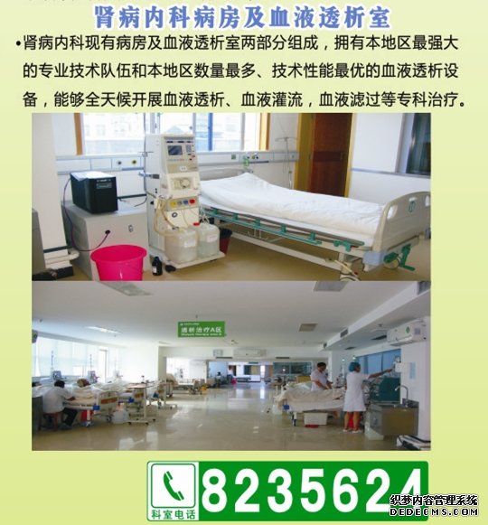腎病內科主要診治:急慢性腎炎,各種腎病及腎病綜合癥、急慢性腎功能衰竭、泌尿系感染、泌尿系結石、系統性紅斑狼瘡、過敏性疾病、糖尿病腎病。該科早已開展血液凈化治療、腹水回收及腹膜透析、靜脈置管、動靜脈造瘺等,利用中西醫治療難治性腎病綜合癥、用激素及CTX沖擊治療重癥狼瘡性腎炎均取得了滿意的效果,CRRT技術在多功能臟器衰竭的危重病人搶救中效果較好。血液透析治療已在我院開展15年,由??漆t生和護士操作,經驗十分豐富,安全性高、治療效果好,血液透析和腹膜透析治療終末期腎臟病、血液灌流搶救各類中毒病人均取得了較好的療效。