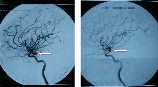 圖四:術前DSA發現右側后交通動脈瘤 圖五:術后DSA檢查右側后交通動脈瘤消失